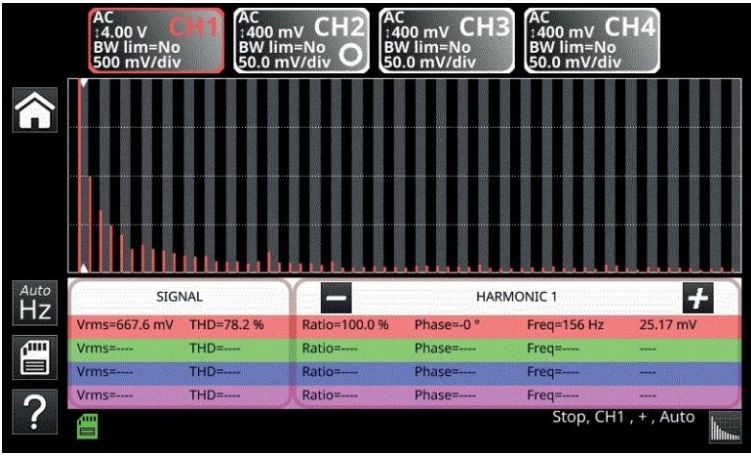 總 Vrms、THD 和選定的順序(% 基波、相位、頻率、Vrms) |