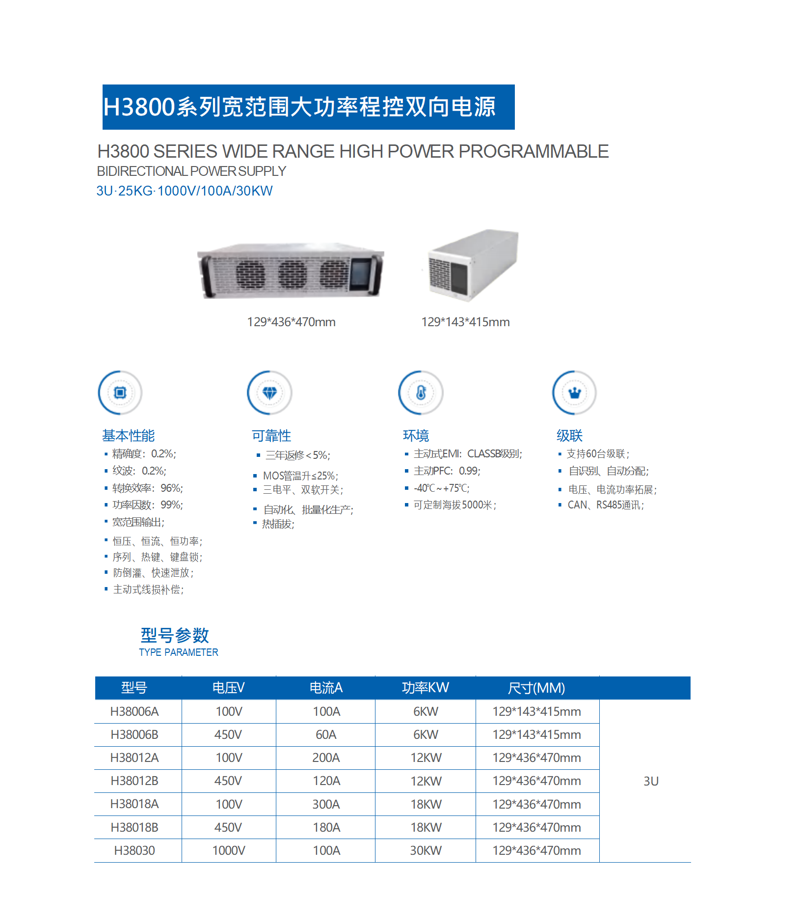 產品概述: 基本性能 精確度:0.2%; 紋波:0.2%; 轉換效率:96%; 功率因數:99%; 寬范圍輸出; 恒壓、恒流、恒功率; 序列、熱鍵、鍵盤鎖; 防倒灌、快速泄放; 主動式線損補償; 可靠性 三年返修<5%; MOS管溫升≤25%; 三電平、雙軟開關; 自動化、批量化生產; 熱插拔; 環境 主動式EMI:CLASSB級別; 主動PFC:0.99; -40℃~+75℃; 可定制海拔5000米; 級聯 支持60臺級聯; 自識別、自動分配; 電壓、電流功率拓展; CAN、RS485通訊;